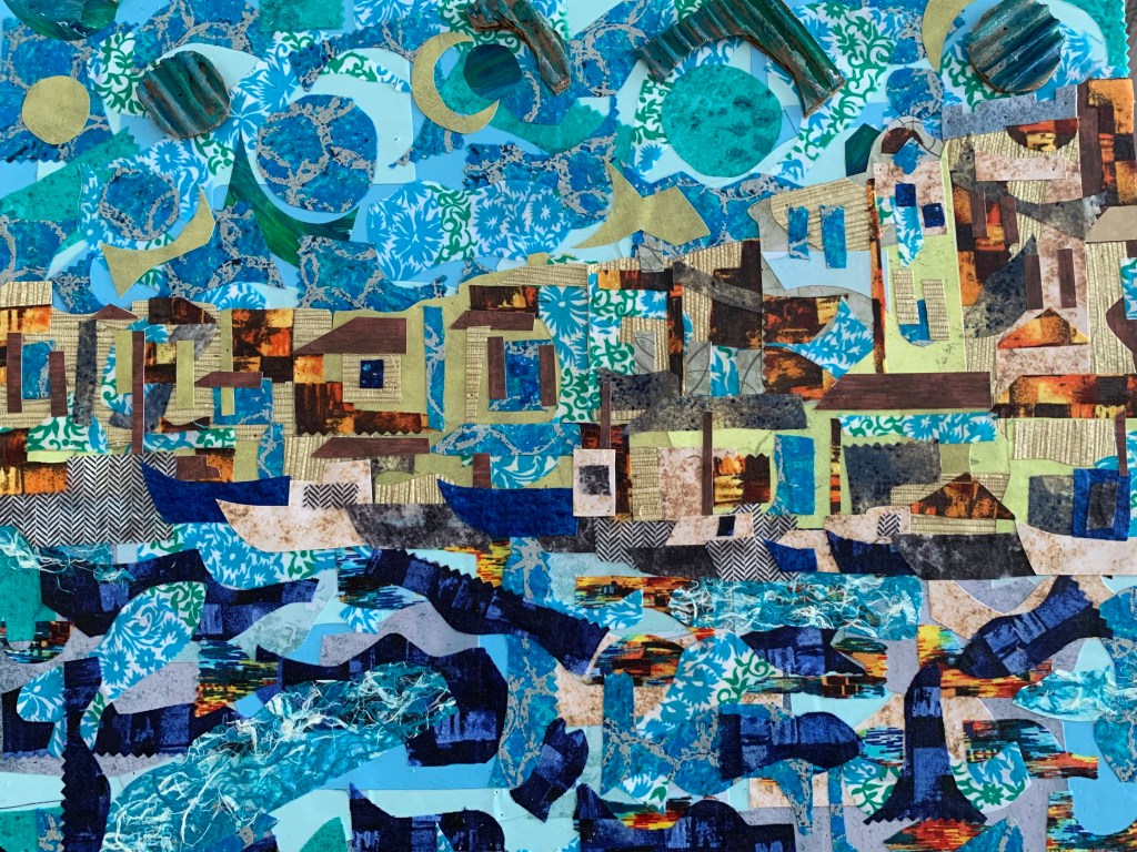 I had the most wonderful honeymoon through France. I took this photo in the lovely village of Cassis. I knew when I returned home I wanted to turn it into a piece of art for our home. Some might have approached it with a realistic interpretation through paint. Some may have used pastel. All great choices for the individual artist. For me, I chose collage. And boy did I had fun!!!!!! I used cardboard, wallpaper, fabric and paper. Voila!