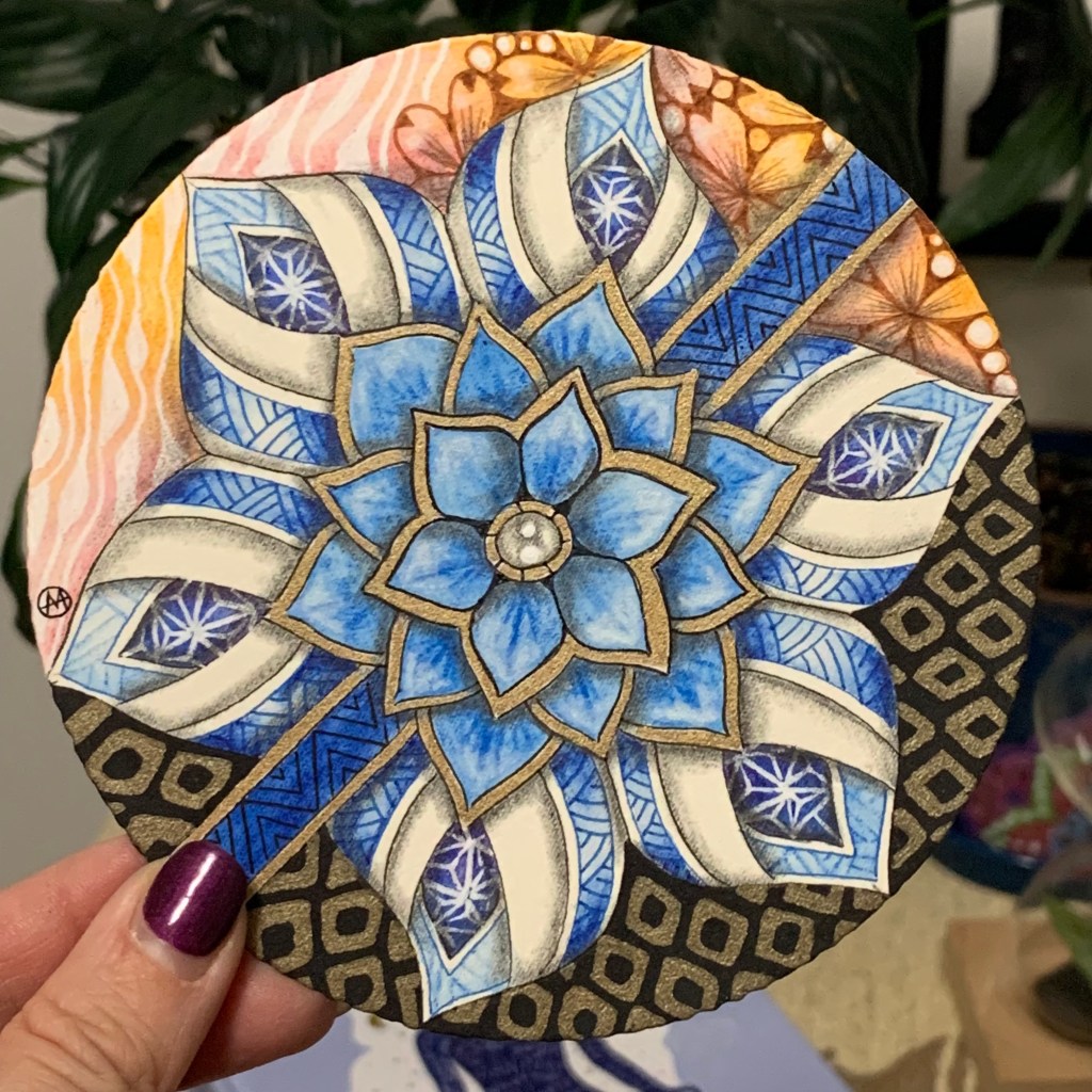 Art is a language that we can all speak. We visually can come together as one. We do not need to verbally speak the same language to create together. I created these two Zendalas from the MidWinter Tangle series. These wonderful CZT’s, from Japan, put together a group of videos you can purchase. I encourage everyone to take classes from outside your geographical area.
