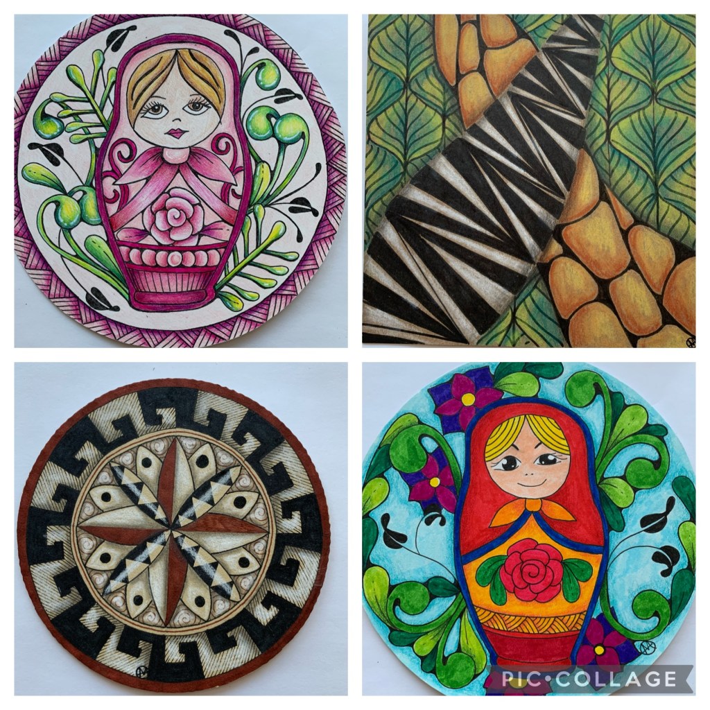 I started with a Tangle Passport class to Mexico, India, and Holland. Students explored tangles and different art mediums.
