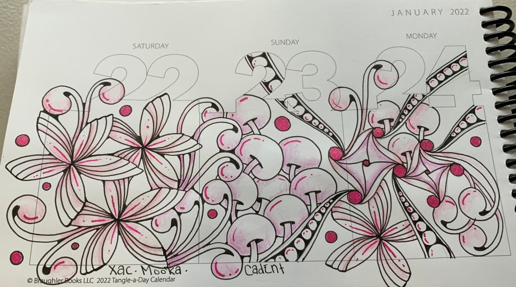 January 22-25: Tangle-A-Day Calendar. Fun with Xac, Mooka, and Cadent. Lets not forget a few orbs too! Loving the opportunity to just let the pen flow in this book.