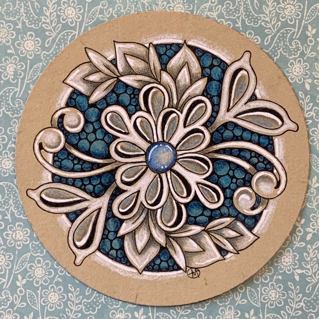 I love how Debbie New’s tangle Spud and Lunarflux compliment one another. I enjoyed drawing them large allowing for extra highlighting and shading space. Adding in Delwhy, deconstructed by Stephanie Jennifer, added to the movement of the tile.