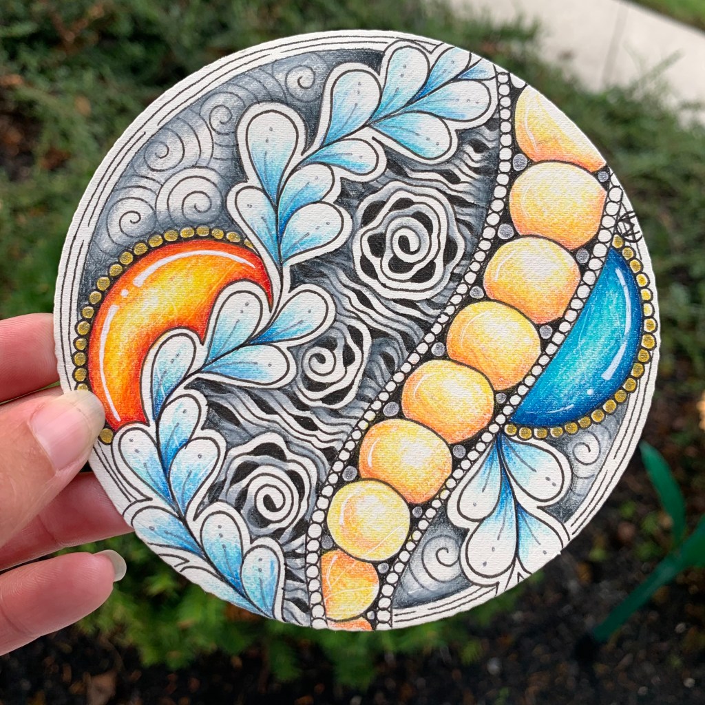 I chose to work on a white Zendala with black micron using colored pencils to shade.