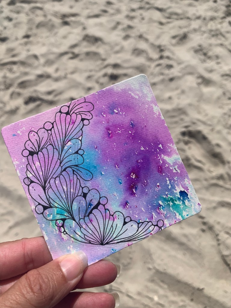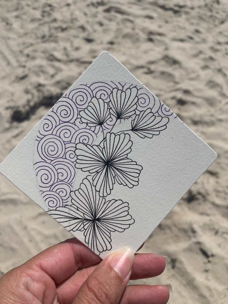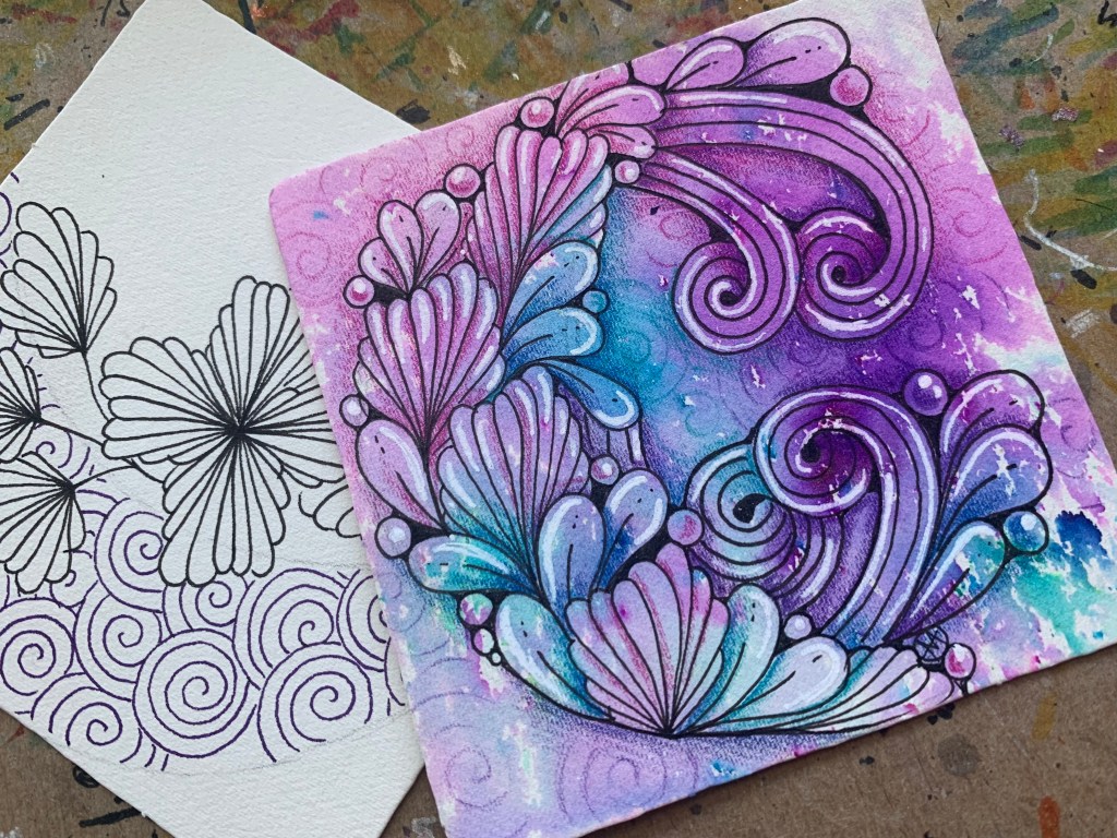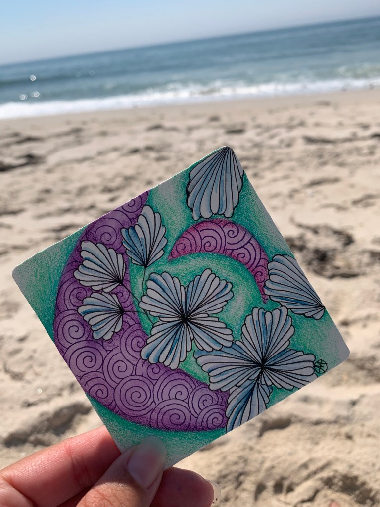 The colored tile to the left is a prepped Magicals tile, with black micron, and some shading with colored pencils.