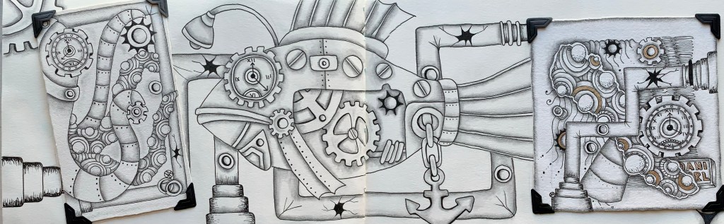 Continuing on my journaling adventure. The tile on the right side is from a class I took with Annie Taylor. Part of the CZT AE2022. It was a wonderful Steampunk class.
