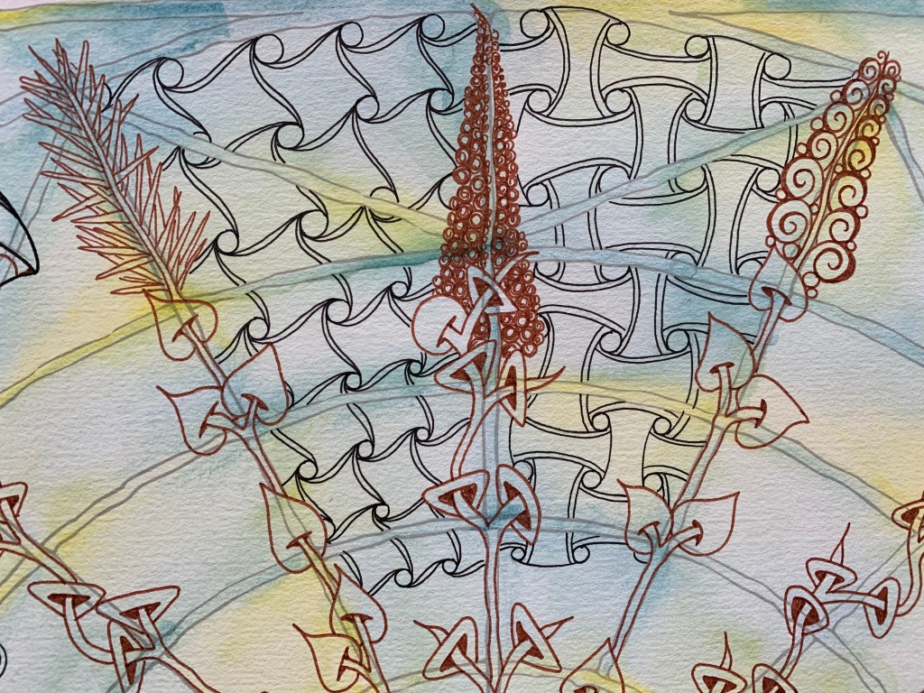 On the 6th day, we added Huggins and Cadent, which are two tangles I love! I desperately want to go in and add some Shattuck, Betweed, or another element to them. I’m going to pause and wait. I’ll see where the rest of the piece brings us and allow myself the option of adding more detail later.