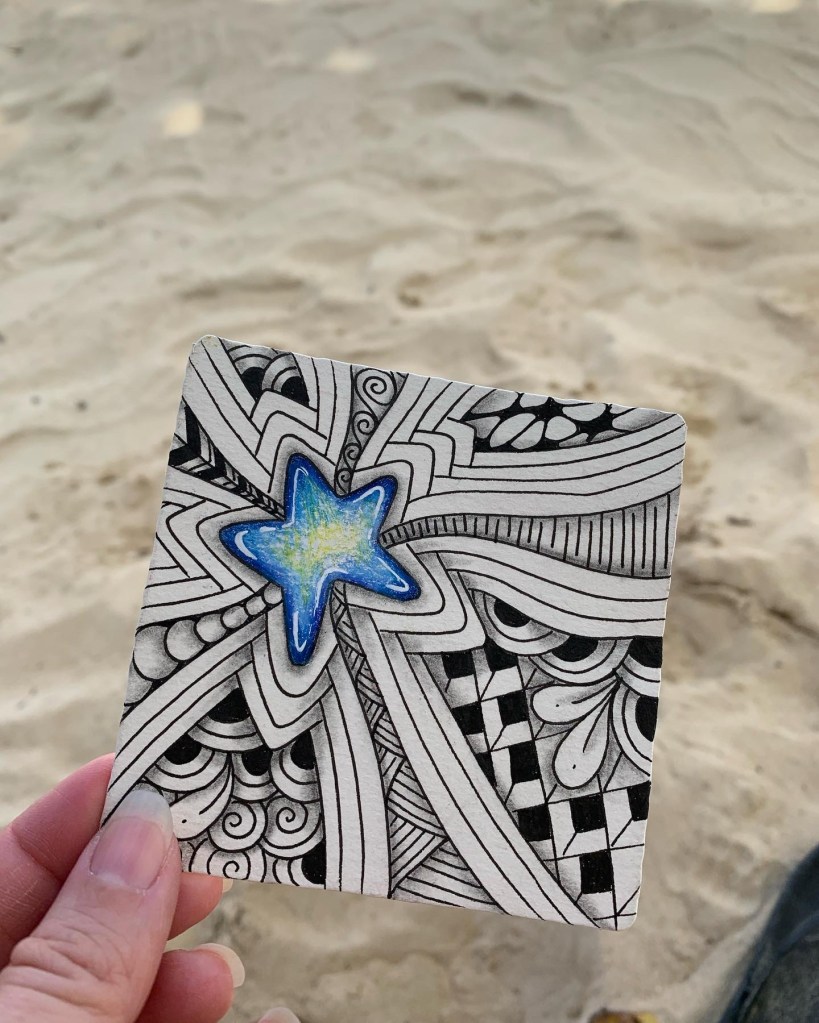 Whats better then a beach day in Jamaica, and tangling on the sand? Not much. Fun time tangling on a tinted tile and a white tile. “One Love.” ❤️