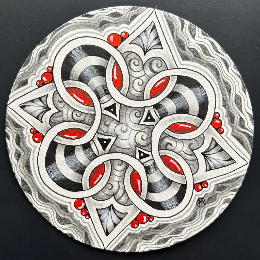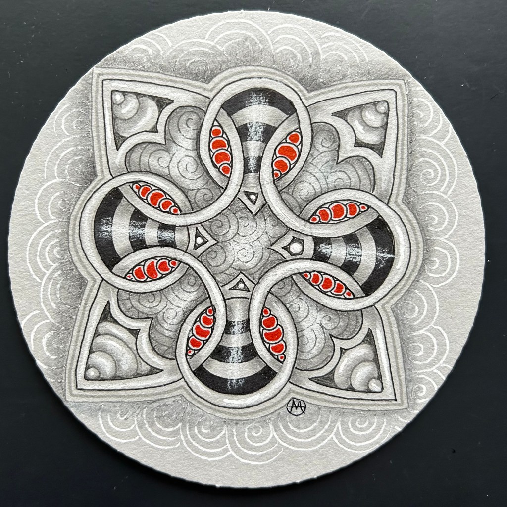 Project Pack 20, Day 2, focused on the pattern Waybop. A beautiful interlocking blossoming tangle. Molly prompted us to use a grey Zendala with a combination of black and gray microns. Shading is always enjoyable on the grey being able to use both graphite and white charcoal.