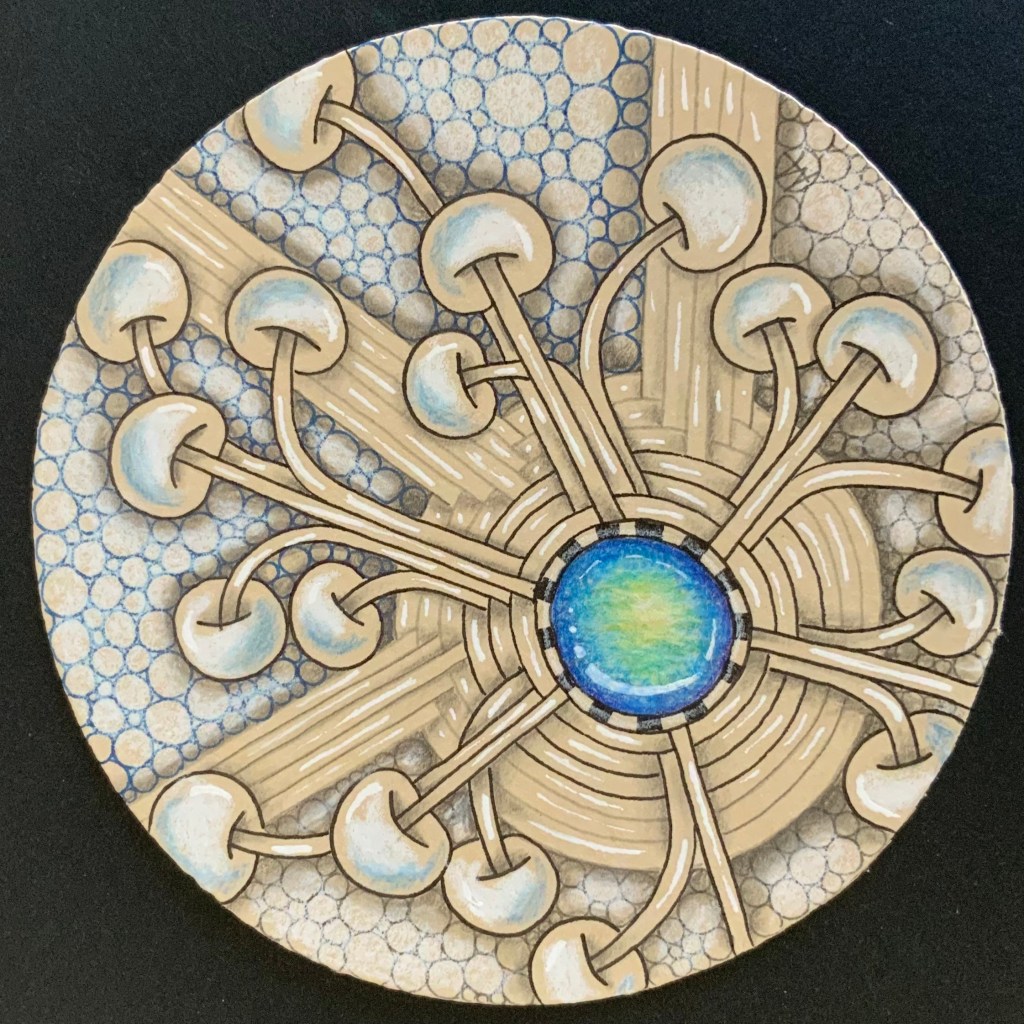 On Day 5 we were led by Julie. Like Julie, Arukas is not a tangle I choose often. I love how Julie incorporated poke root into it. We worked on a tan tile. I added a few extra elements to the first photo shown here.