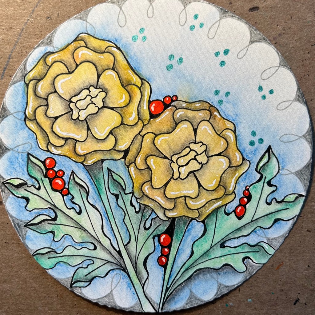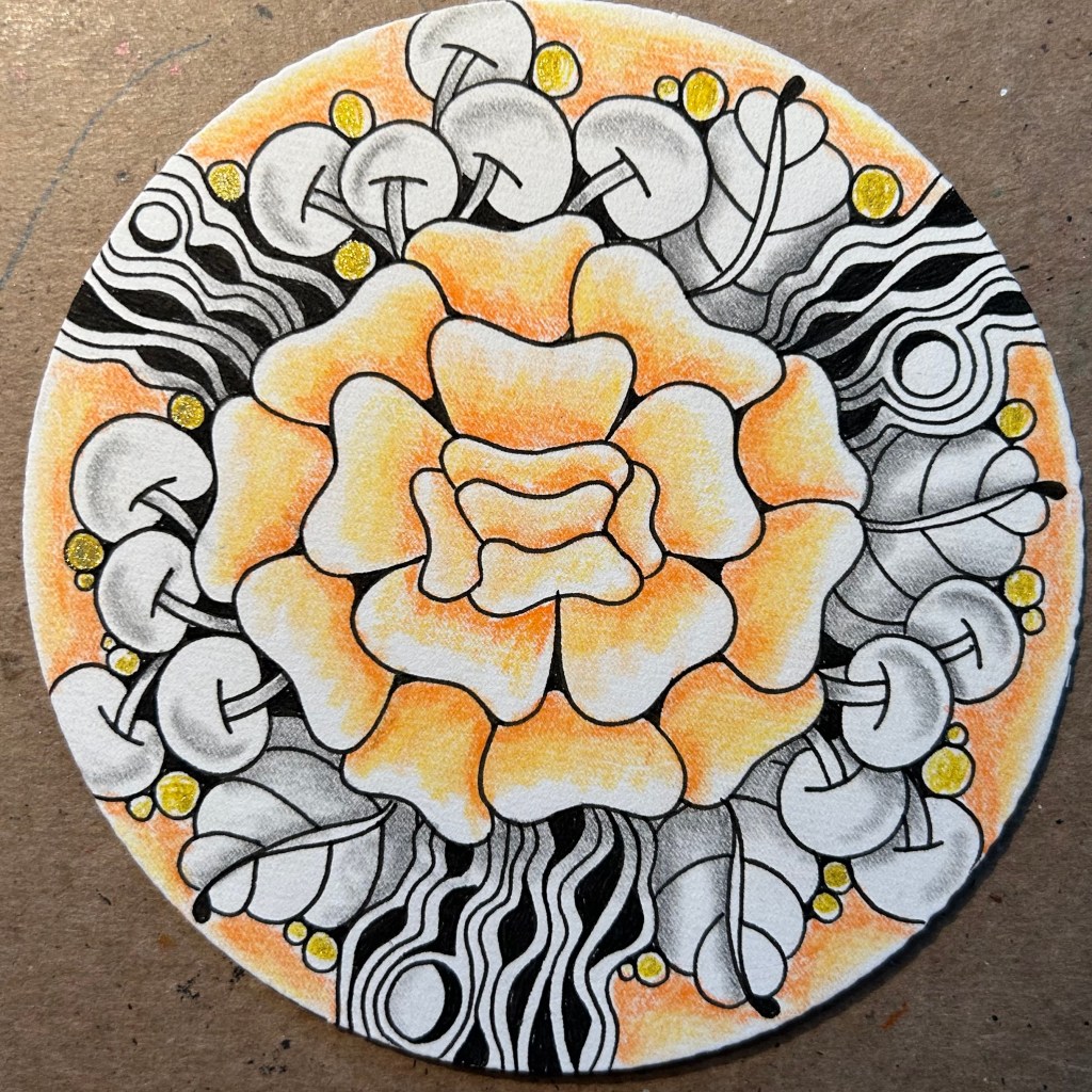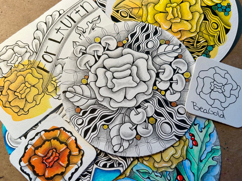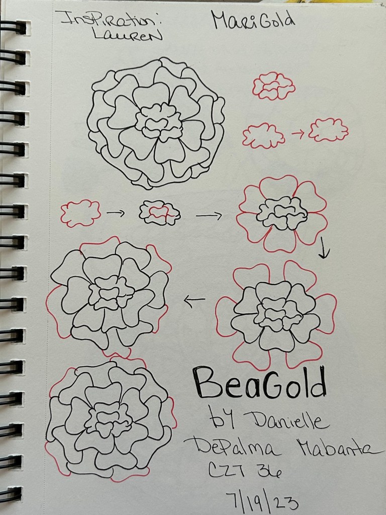 I’m excited to share my new tangle named “Beagold.” Over the summer I was enjoying a nice breakfast with my friend Lauren. I was saying how the negativity from others, in my life, was really effecting me. Bringing me down. Lauren had spent a few years as a mentor for teachers. She told me about something she would share with her new teachers. The Marigold Effect. You can read about here. https://www.cultofpedagogy.com/marigolds/