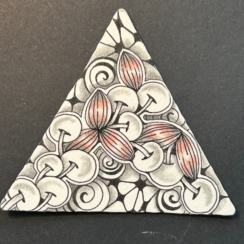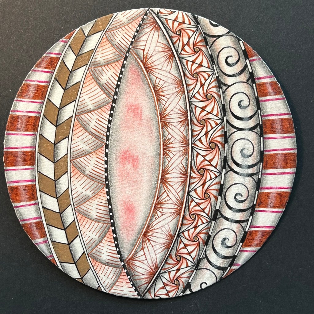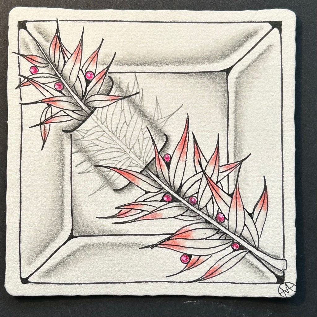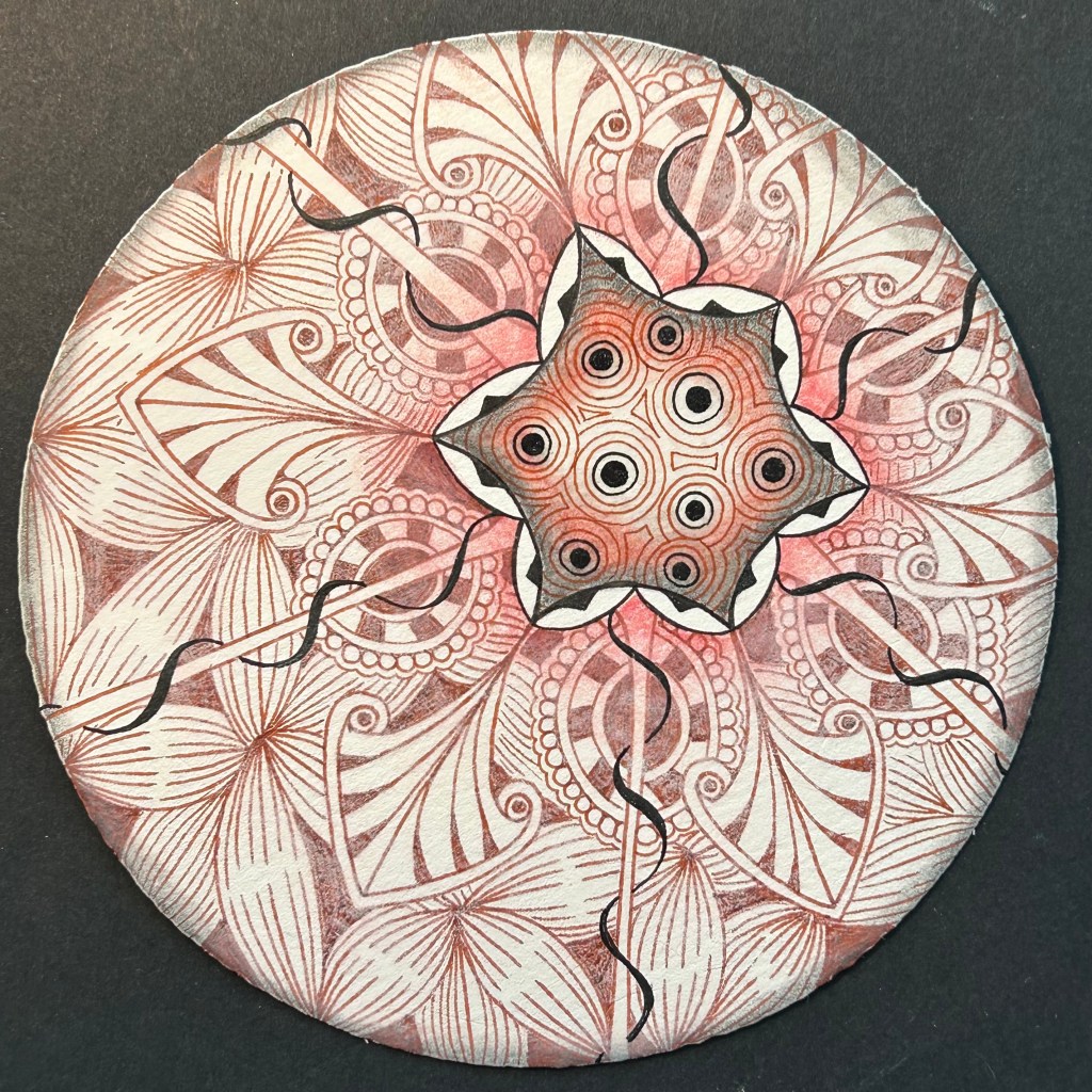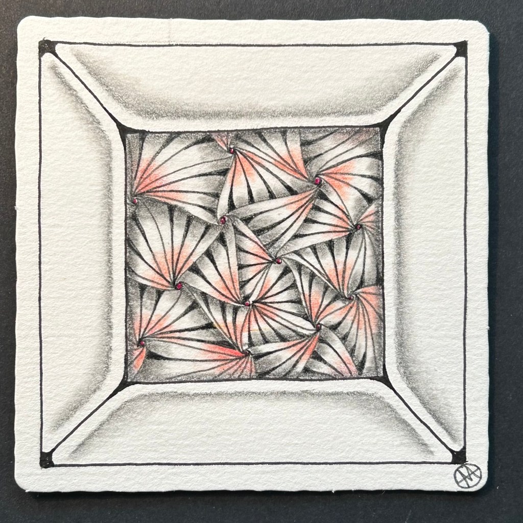 I always love attending classes with Molly and Martha. They create a fun and safe environment for beginners to advanced tanglers. I highly recommend attending a weekend even if it’s your first time. Remember we all were beginners at one point! If I have extra time I enjoy having an extra tile going, playing with concepts that we have learned. Like the one to the right here.
