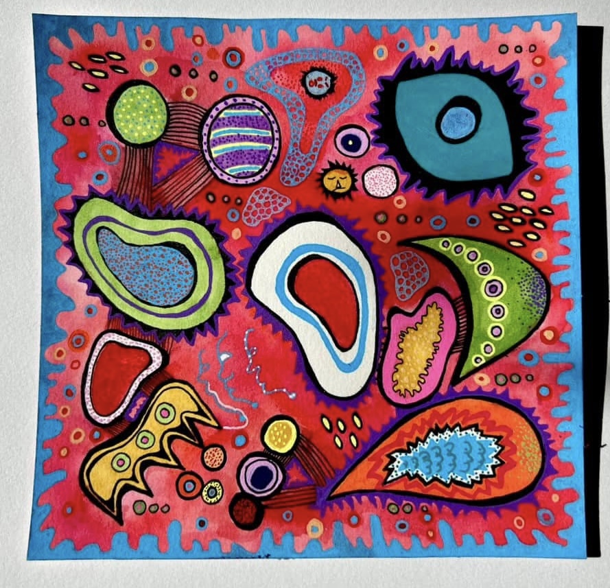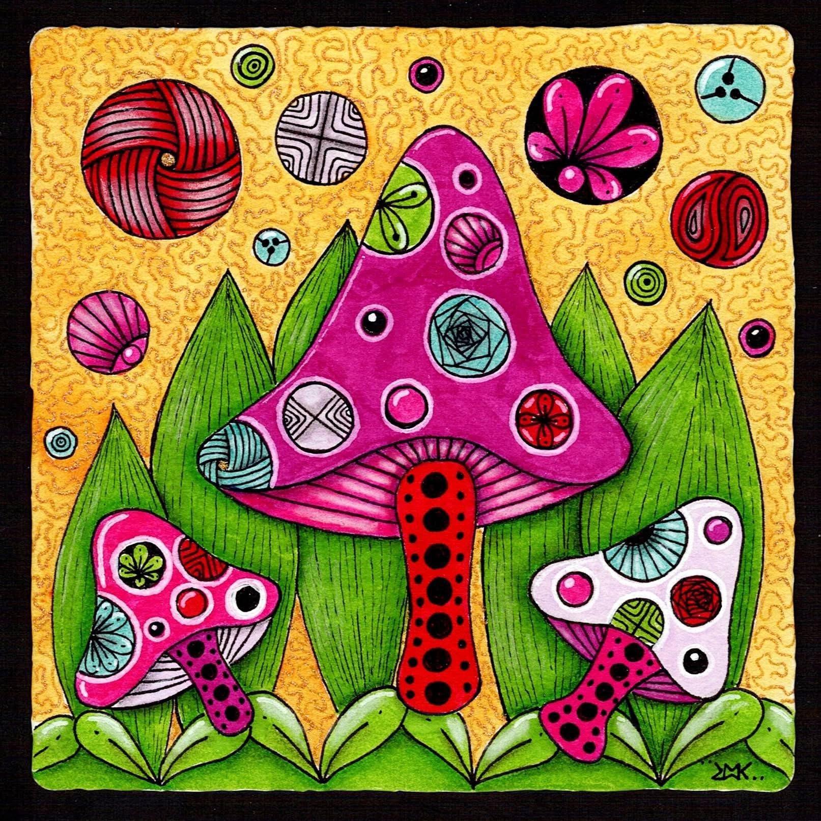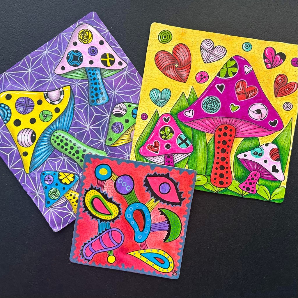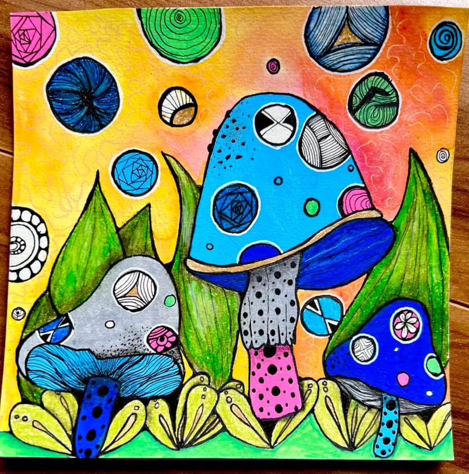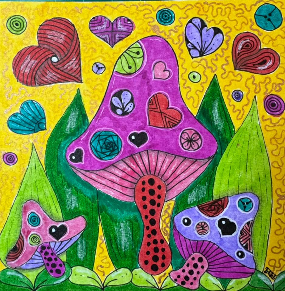 But why limit my excitement to just my middle school students? I decided to teach a ZIA (Zentangle Inspired Art) class for my adult students on Zoom. While Kusama didn’t directly use Zentangle in her work, we found patterns that were quite similar. Together, we created fantasy mushroom tiles, incorporating Zentangle patterns and fragments. It was such a fun class, and the results were amazing! I loved seeing everyone’s enthusiasm for learning about Kusama! Enjoy some of the lovely tiles above! And did I mention I dressed up to play the part?!