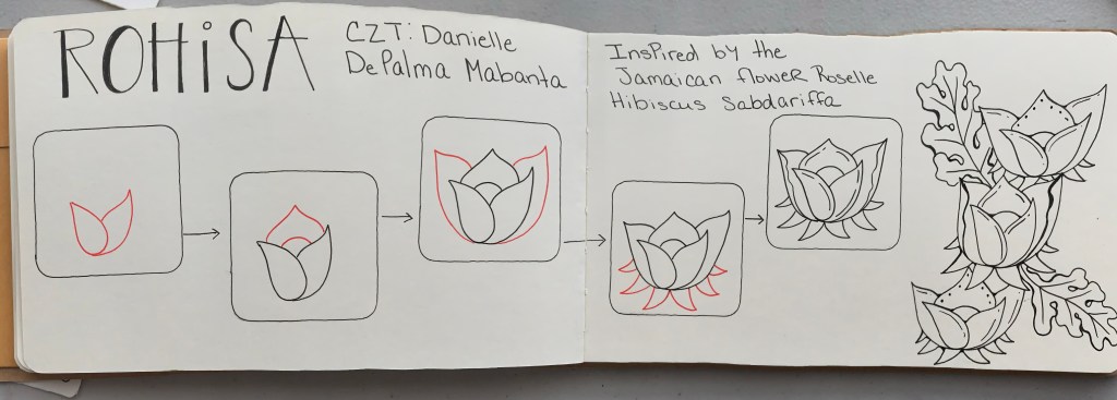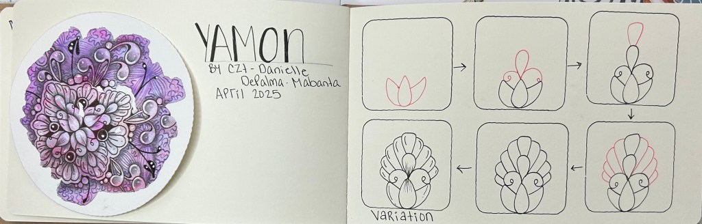 I deconstructed Yamon, on my trip to Jamaica, this past April 2025. It isn’t a pattern I found on the Island however. It was from an Egyptian Ceiling that I became inspired by. One of the employees at the resort took interest in my pool side drawing and helped me name it. And Yamon was born! Enjoy tangling it!